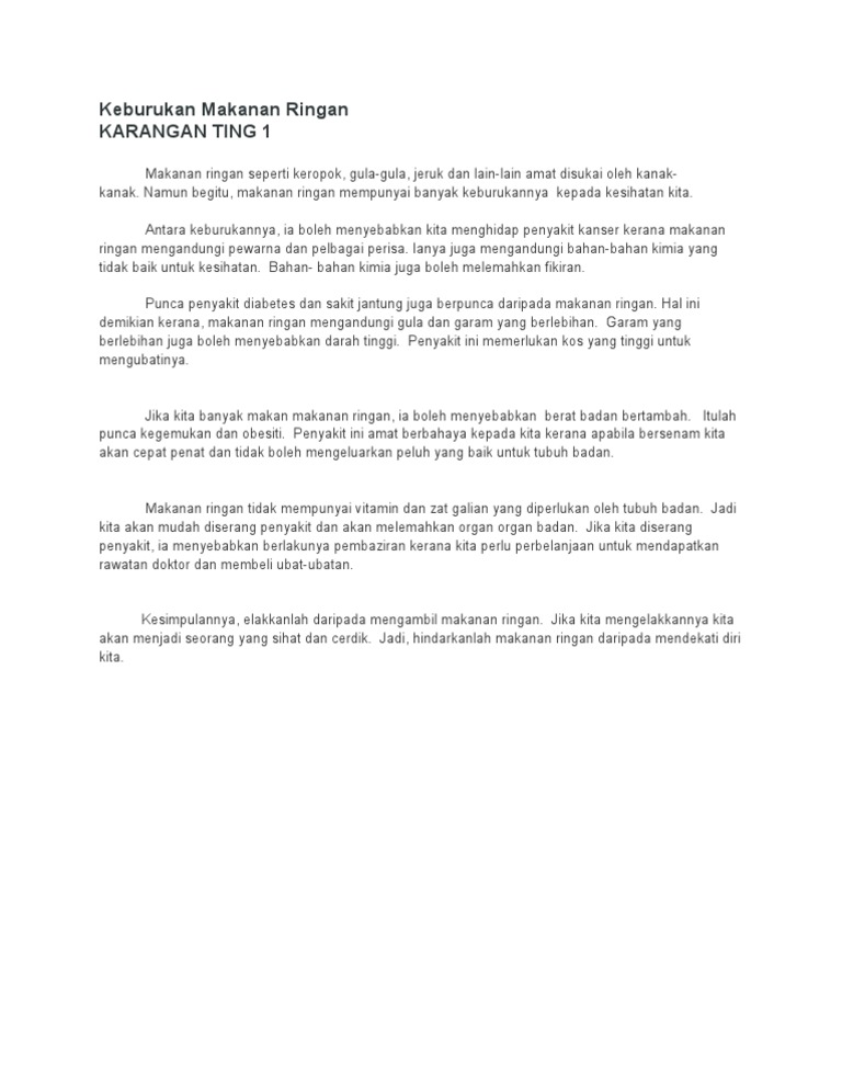 34 Guru Minta murid menulis karangan. Kurangkan makanan segera Kurangkan makanan ringanAgar sihat sentiasa Agar sihat sentiasa 2x. Selain itu semaklah aspek bahasa seperti tatabahasa ejaan tanda baca dan struktur ayat.